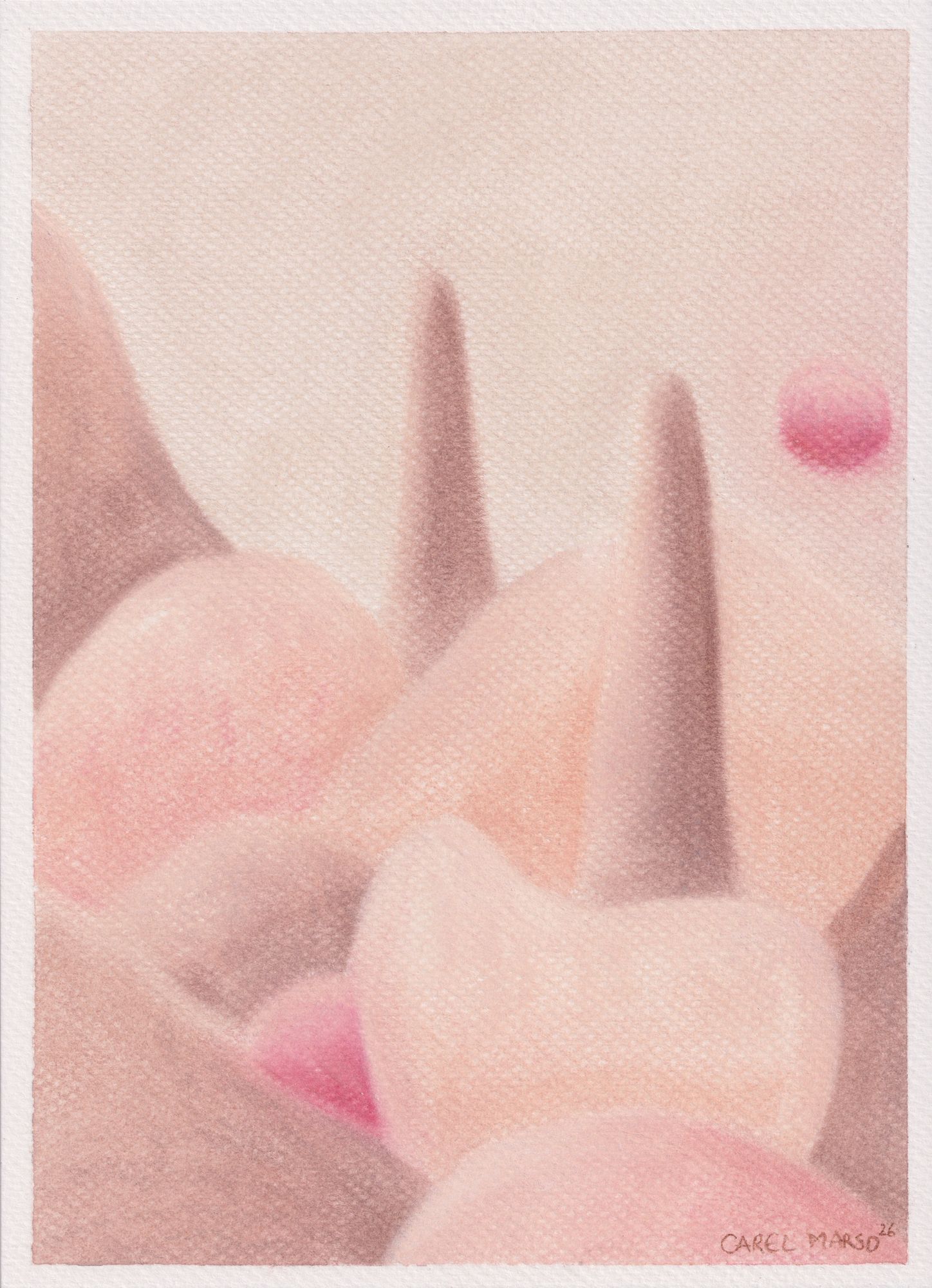 Working with organic forms and restrained color palettes, she approaches color as a subtle expressive vocabulary. As historian Michel Pastoureau observes, colors are never innocent; they speak, murmur, and carry meaning. In her practice, color operates through softness and nuance, inviting slow looking and emotional attentiveness.