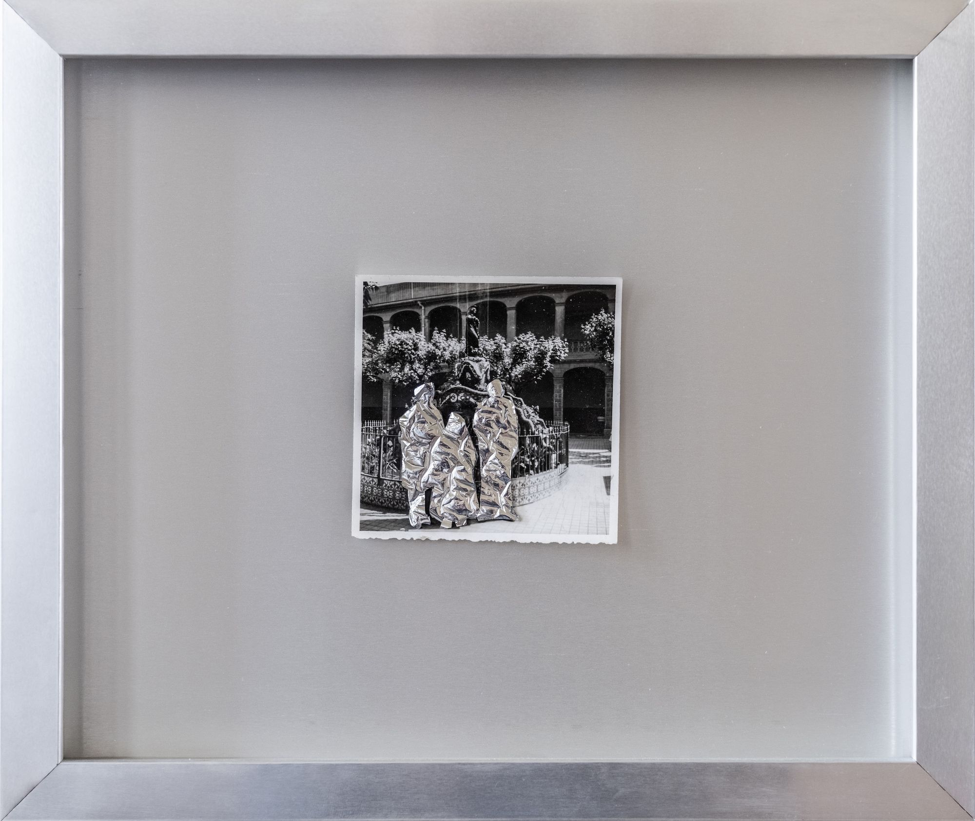 Vintage photograph, leftover mylar, nylon thread in an aluminium frame