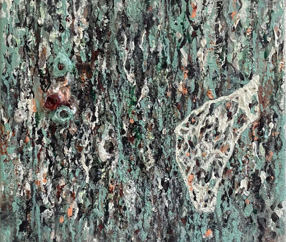 Acrylic, wall paint collected from Fayyad Building (post-Beirut Explosion), paraffin wax (post-Harissa Prayers), hot glue sticks, threads, archival glue and varnish on canvas
